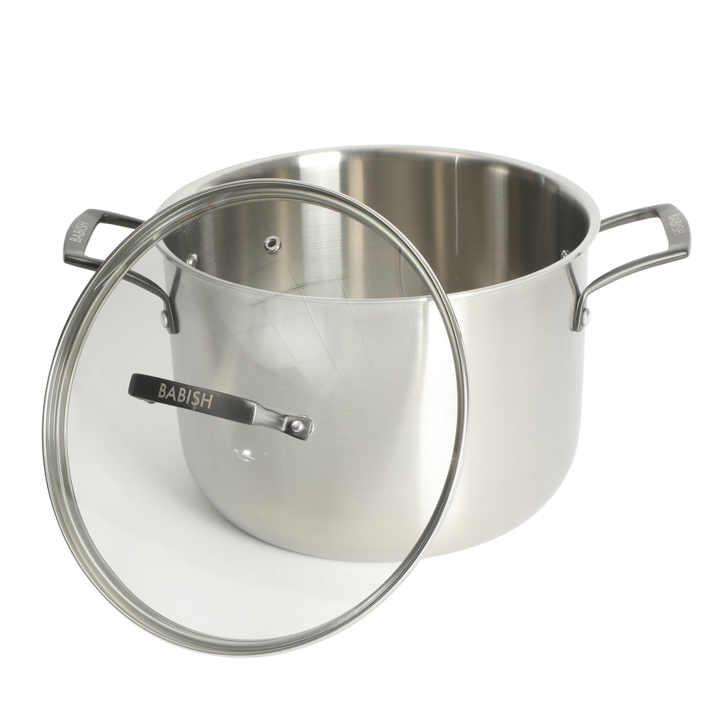 A pot that can stand the heat of everyday cooking, the Babish Stainless Steel Stock Pot with Lid is what every cooking rookie or culinary master needs. Tri-ply stainless steel construction maximizes durability to hold up to high temperatures for the perfect sear and sizzle. This has a base-to-rim aluminum core to promote even heat distribution to eliminate hot spots and unevenly cooked food. Crispy, golden-brown edges, savory glazes, tomato-based sauces maintain their natural flavors and texture without any metallic aftertaste from the cookware's non-reactive interior. Compatible with all types of stovetops, it has Y-shaped stainless steel handles to stay cool and dissipate heat for a comfortable grip. Oven safe up to 500°F. Dishwasher safe, hand wash recommended.