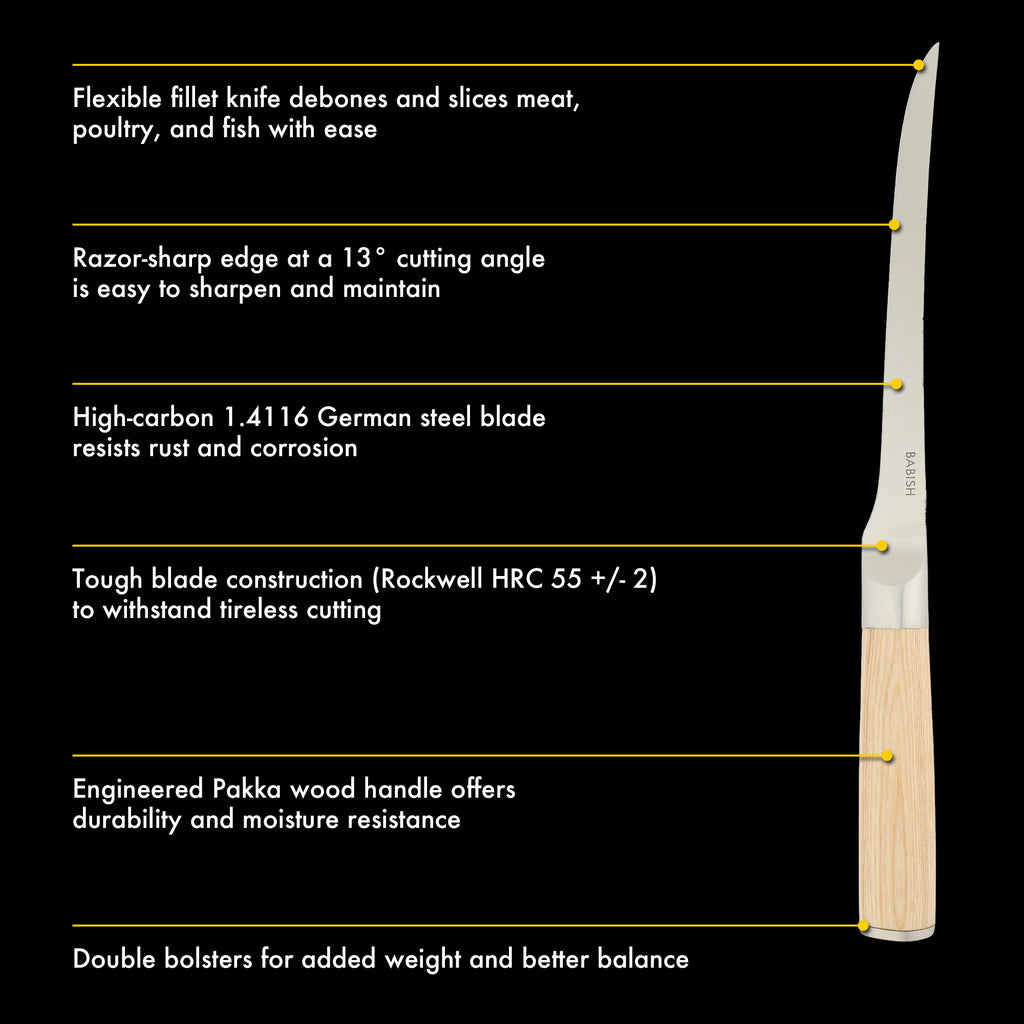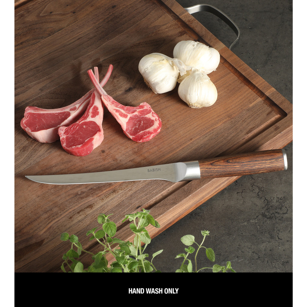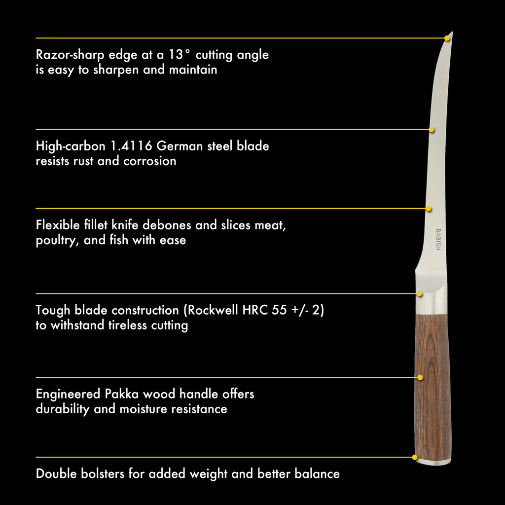 For salmon slices, lobster tails, cod fillets, and tuna sashimi, the Babish 7-inch German Steel Fillet Knife handles delicate seafood with care and precision. The forged German steel construction maintains maximum sharpness and offers superior rust resistance to withstand the demands of everyday use. The full-tang blade provides even weight distribution for better support and control. Masterfully crafted to yield clean slices every time, this fillet knife is crafted for clean and delicate work, making it the perfect tool for preparing the freshest catch of the day. Hand wash only.