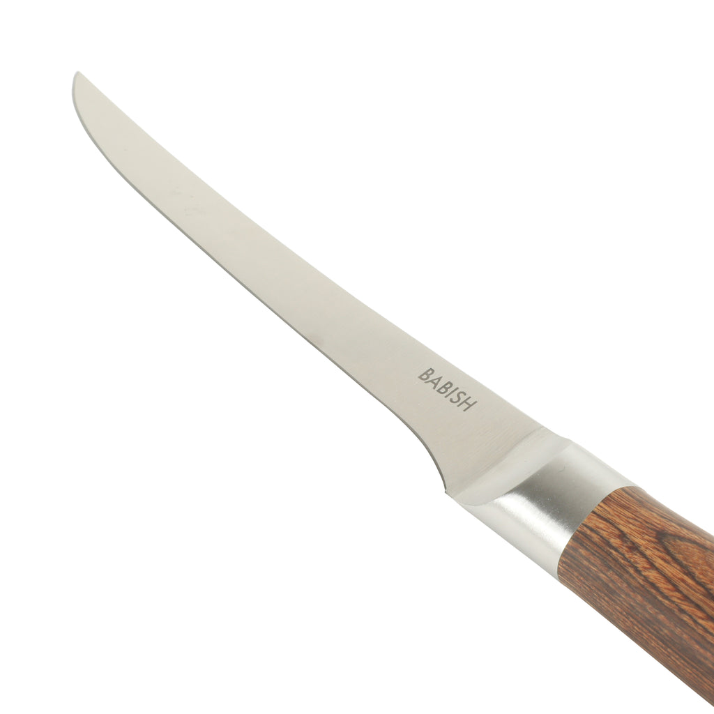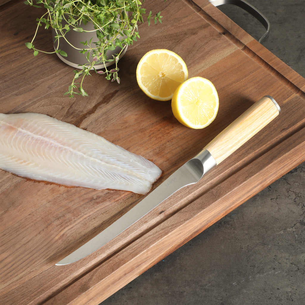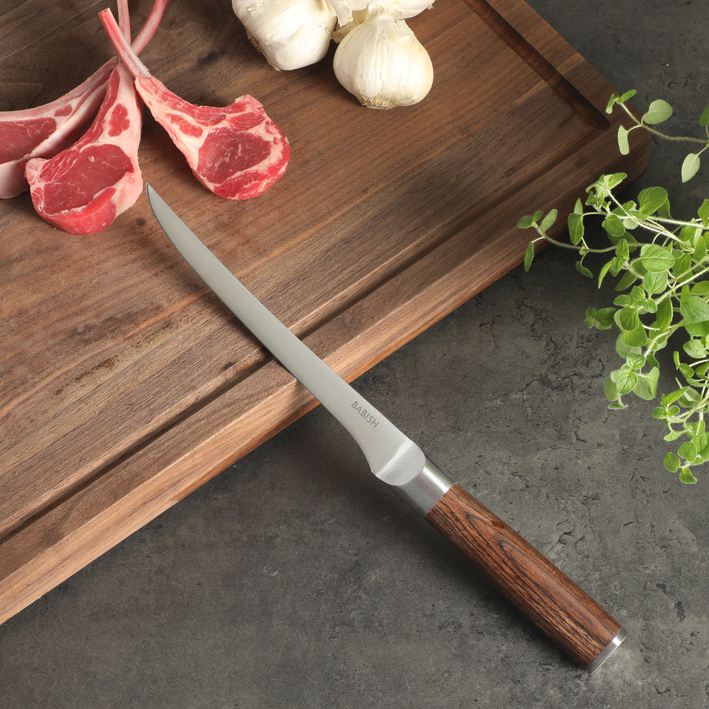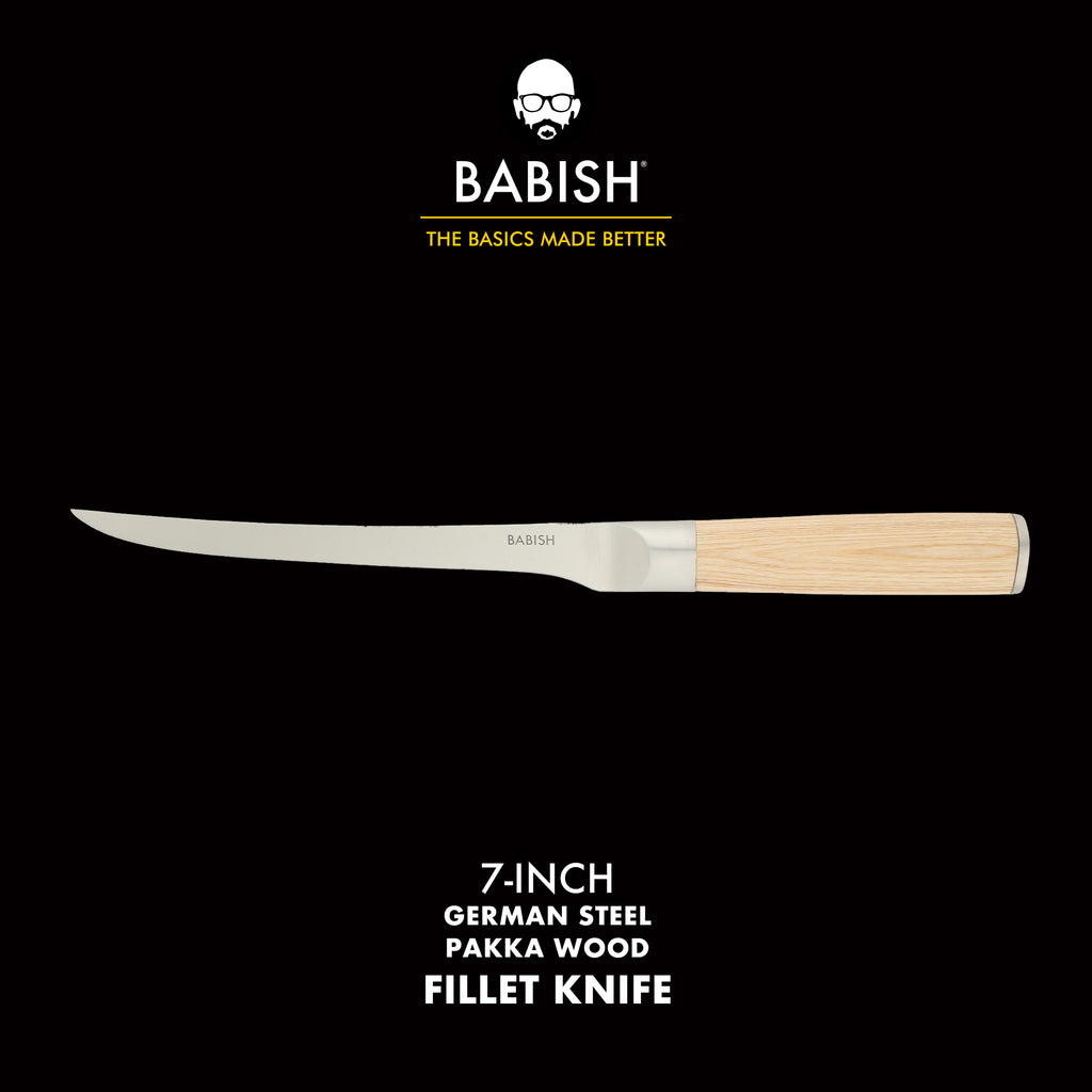 For salmon slices, lobster tails, cod fillets, and tuna sashimi, the Babish 7-inch German Steel Fillet Knife handles delicate seafood with care and precision. The forged German steel construction maintains maximum sharpness and offers superior rust resistance to withstand the demands of everyday use. The full-tang blade provides even weight distribution for better support and control. Masterfully crafted to yield clean slices every time, this fillet knife is crafted for clean and delicate work, making it the perfect tool for preparing the freshest catch of the day. Hand wash only.