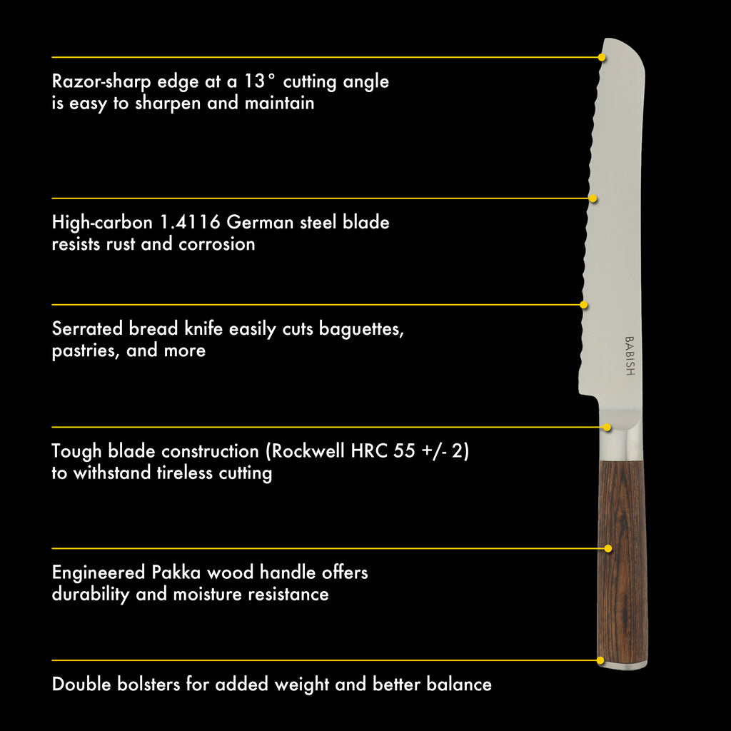 Take a stab at serving homemade artisanal breads with the Babish 8-inch German Steel Bread Knife. Constructed from 1.4116 German steel, it features a sharp, serrated blade to slice loaves with ease.