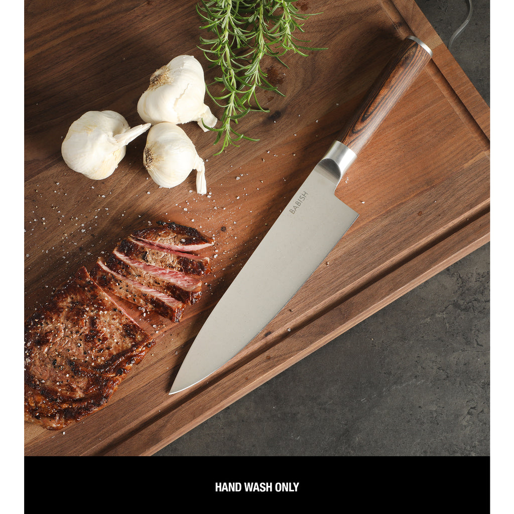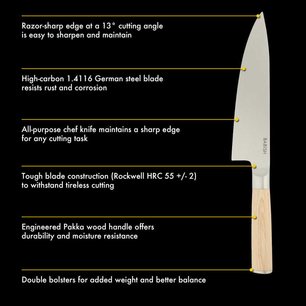 Slice and dice your way through piles of veggies or primal cuts of beef with the Babish 8-inch Stainless Steel Chef's Knife. Made from high-carbon German Steel, this chef's knife is precision-forged, tempered and hand-ground for maximum sharpness. It features a full tang handle with a strong yet sleek handle for a balanced and comfortable grip. With just the right amount of rock and gentle taper, this knife is perfect for both heavy chopping and fine slicing, easily making it a perfect multi-purpose knife for all your kitchen prep needs. Hand wash only.