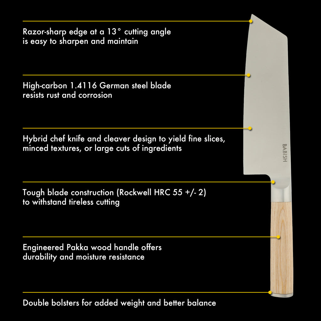 The Babish 7.5-inch Stainless Steel Clef Knife gives you the best of both worlds. A combination of a chef's knife and a cleaver, this hybrid knife marries the precision of a chef's knife and the utility of a cleaver. It features a perfectly tapered edge with a wide surface area perfect for scooping up freshly-chopped ingredients. Precision-forged form a single piece of high-carbon German Steel, it features an engineered Pakka wood handle that provides a secure, comfortable grip. Hand wash only.