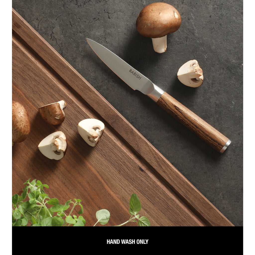 Easily maneuver through fruit skins and rinds with the Babish 3.5-inch German Steel Paring Knife. Constructed from high-carbon, 1.4116 German steel, it achieves precise peels and fine textures with its forged, full tang blade at a 13° cutting edge angle. The engineered Pakka wood handle offers a secure and balanced grip for safety and control. Hand wash only.