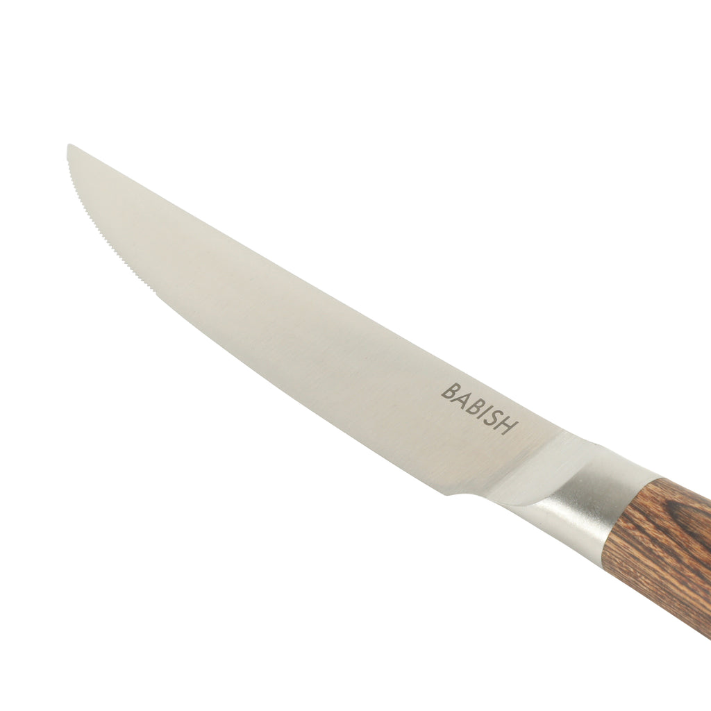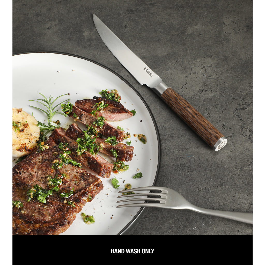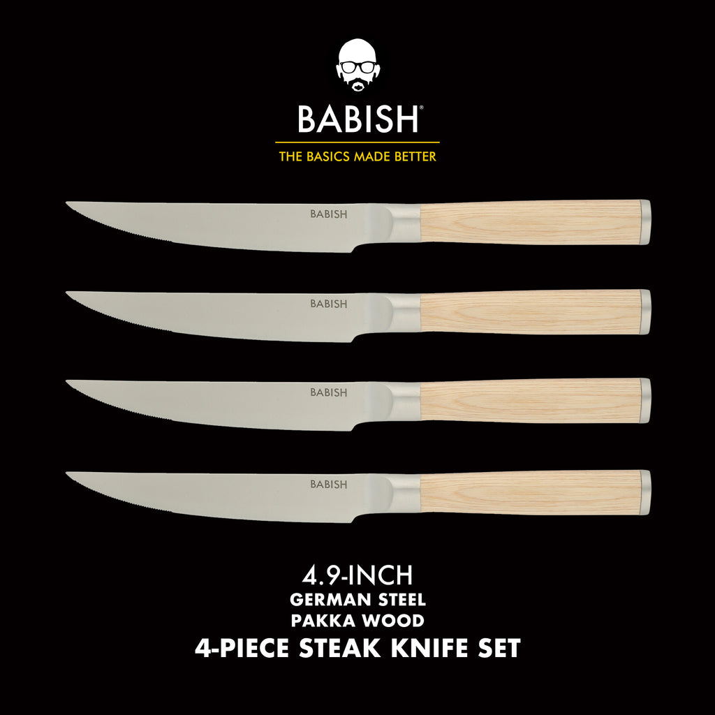 Enjoy premium cuts of meat with the Babish 4-piece Steak Knife Set. Constructed from high-carbon, quality 1.4116 German steel, each steak knife features a precision-forged, full tang blade to sharply slice through meat, poultry, and more. The versatile, sleek design provides everyday elegance at your fingertips, while complementing any tabletop piece or place setting. Engineered Pakka wood handles provide strength and balance when cutting. This set is also a beautiful and practical gift for birthdays, housewarmings, or any special occasion. Easy to clean and maintain, these knives are the prime choice for everyday use. Hand wash only.