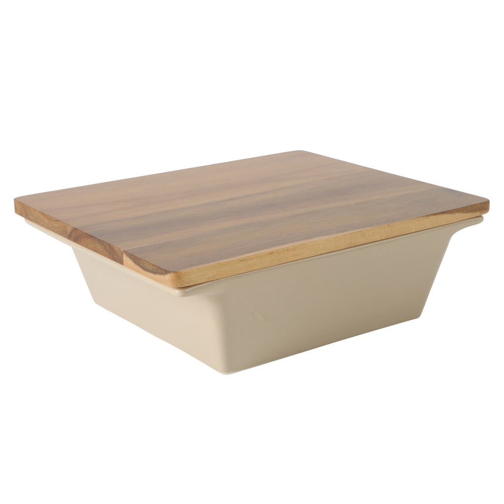 - OVEN-TO-TABLE BAKEWARE: Sturdy handles make it a breeze to go from oven to table, while the acacia wood lids can act as a trivet to protect any surface from heat when serving baked dishes.