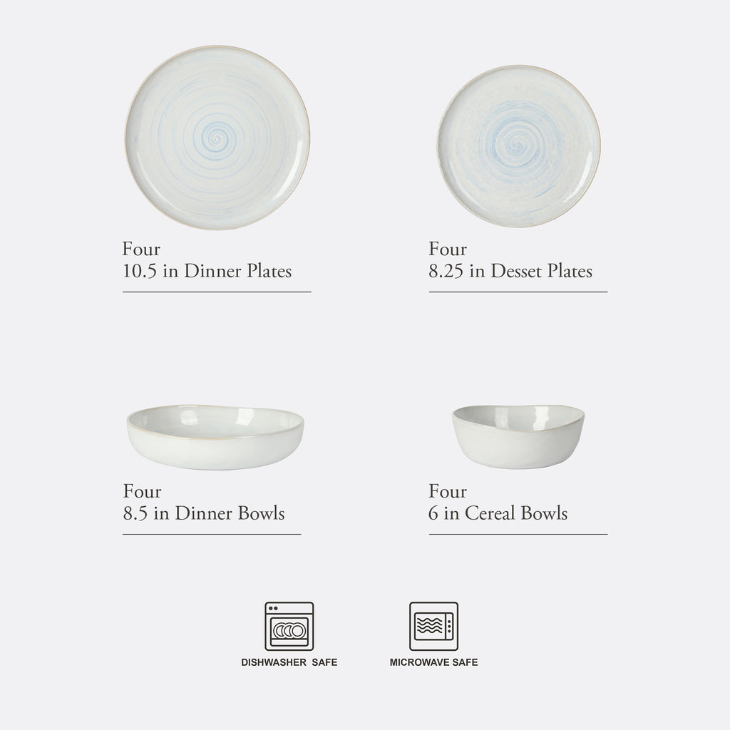 - WHAT'S IN THE BOX: Four 10.5-inch dinner plates, four 8.25-inch dessert plates, four 8.5-inch dinner bowls, and four 6-inch cereal bowls