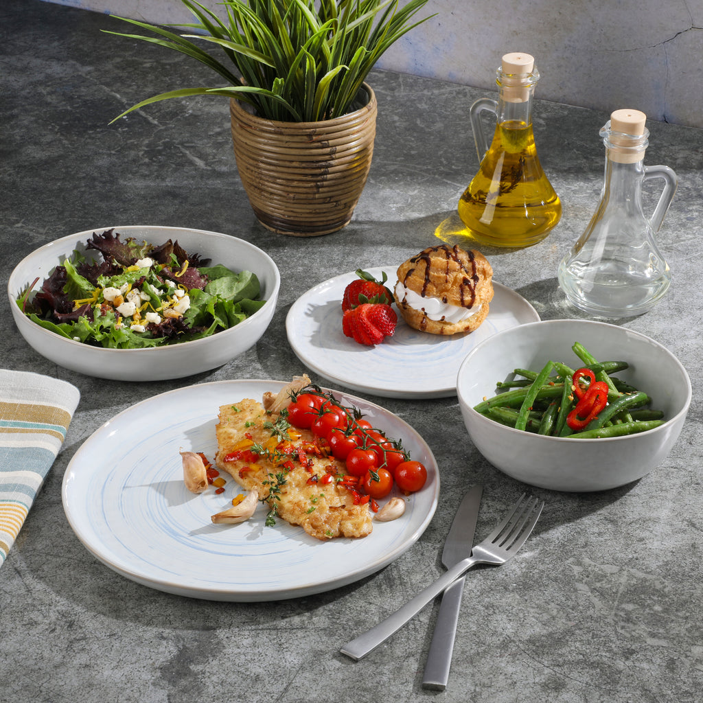 Fascinating settings draw the eye from the full table spread, to the design details down to the creative platings. A mesmerizing collection of reactive dinner plates and bowls, the Auckland 16-piece Dinnerware from Gibson Elite recreates fluidity and movement with cloud-like swirls for a beautiful backdrop to every dining experience. Suitable to mix and match with bold colors or playful patterns, each plate and bowl is crafted from durable stoneware for strength and easy cleanup. Share the joy of entertaining with family and friends by gifting them this timeless dinnerware collection for weddings, housewarmings, birthdays, holidays, and more. Dishwasher and microwave safe.