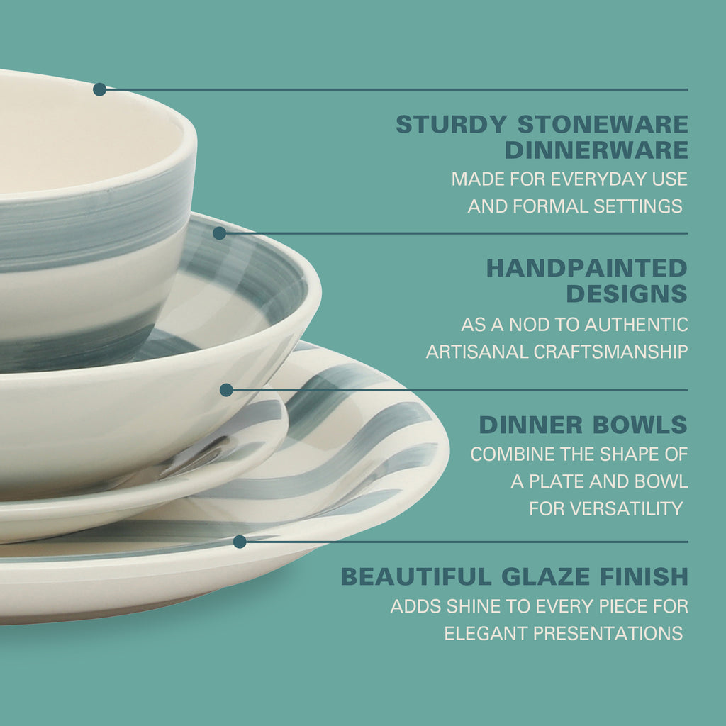 Rookie party planners and veteran homemakers agree that the secret to transform an ordinary meal into a memorable dining experience lies in the details. The Kenwood Shores Handpainted Dinnerware Set from Gibson Home highlights the importance of a beautiful table arrangement that's as visually appealing as it is deliciously appetizing. Handpainted designs on every glazed stoneware plate or bowl show off the intricacies behind traditional ceramic making that your guests will appreciate. Topped with a high-gloss finish, the watercolor-inspired stripes gleam with a brilliant shine, enhancing every table setting with elegance. Share the joy of entertaining with family and friends by gifting them this timeless dinnerware collection for weddings, housewarmings, birthdays, holidays, and more. Dishwasher and microwave safe.