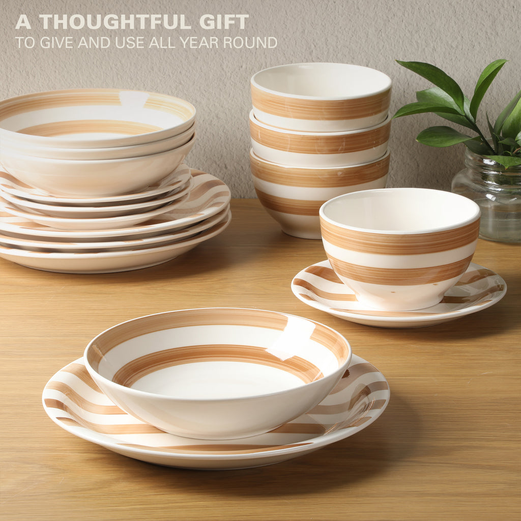 - HANDPAINTED STRIPES: Watercolor-inspired patterns showcase the attention to detail in the design process as a nod to authentic artisanal craftsmanship. Finished with a high-gloss glaze, each piece has a brilliant shine for elegant presentations.