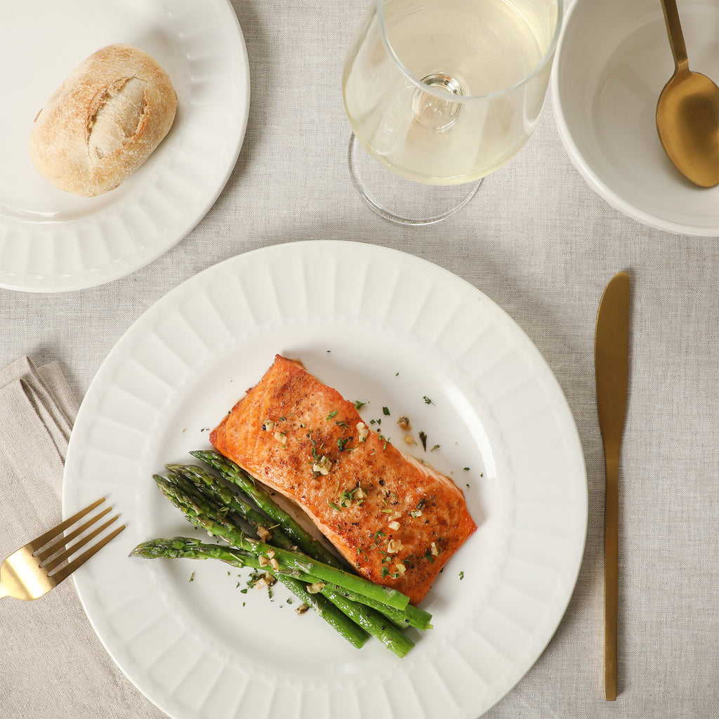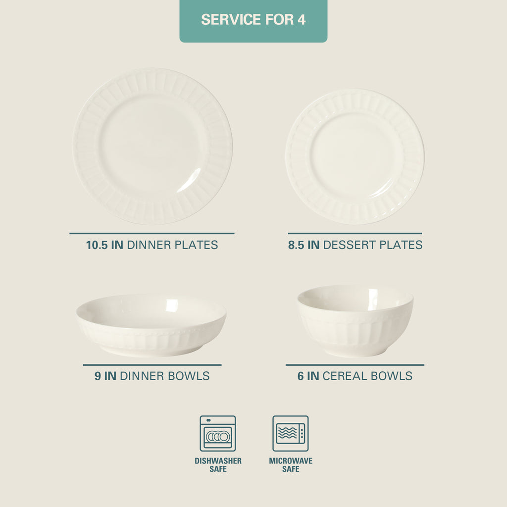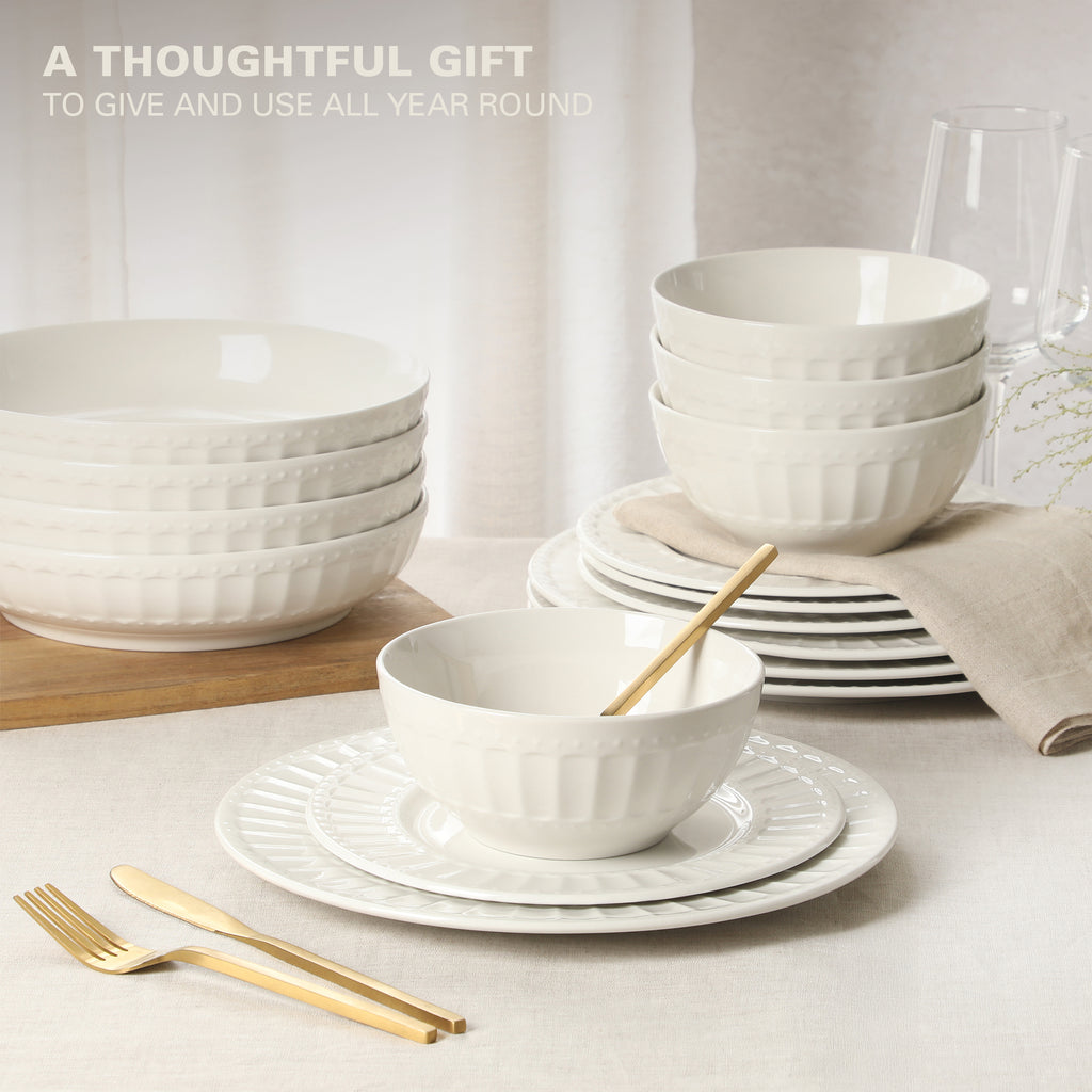 - EMBOSSED DESIGNS: Embossed ridges give depth and texture to bring extra character to the classic and timeless design of each plate and bowl. The pristine white color and glazed finish maintain a sophisticated look for everyday dining and year-round entertaining.
