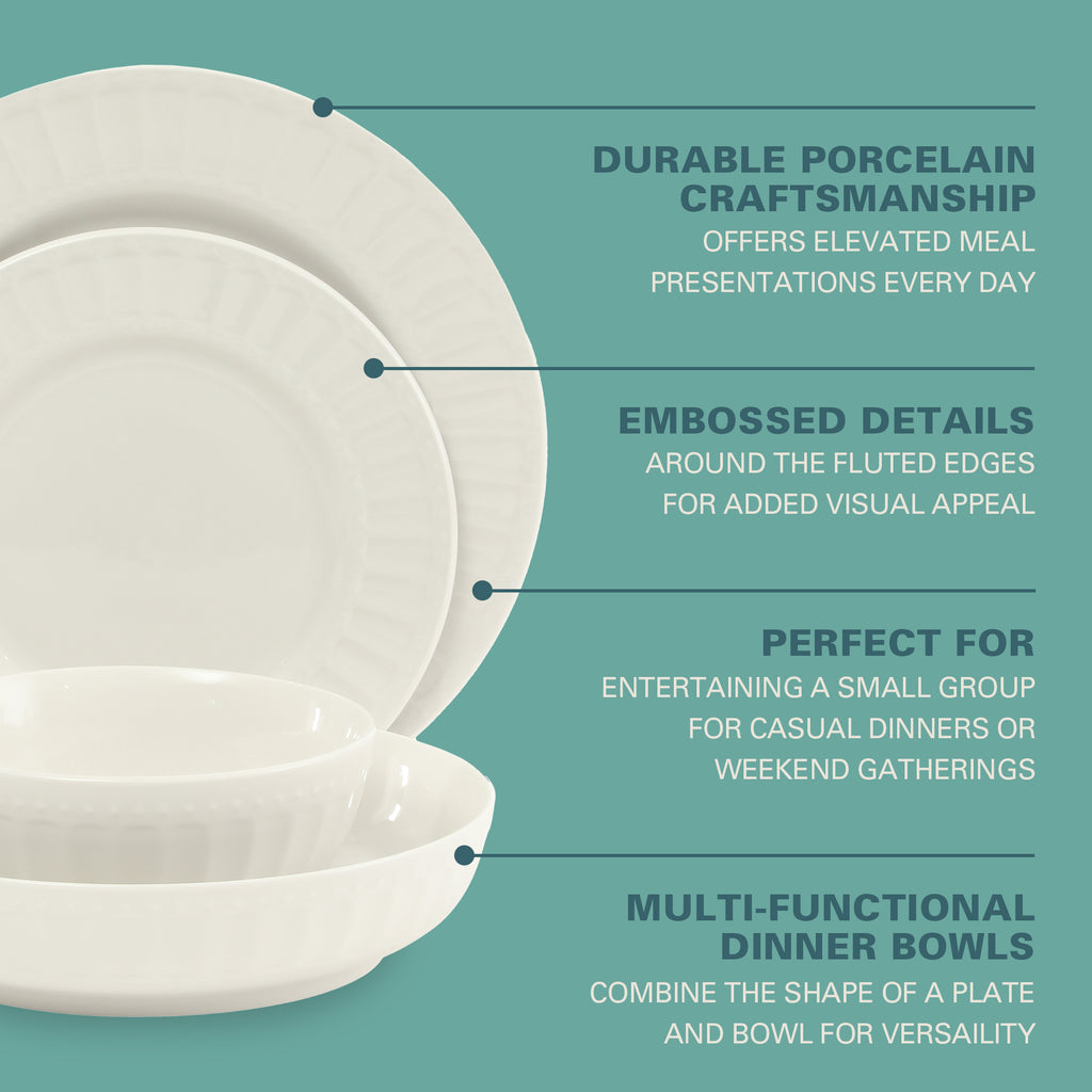 - PORCELAIN DINNERWARE: Crafted from porcelain, this dinnerware collection resists chipping and breakage to offer durability for everyday use or occasional parties.