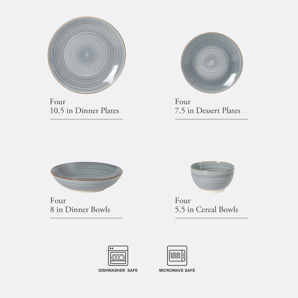 - FOUR PLACE SETTINGS: This complete dinnerware set includes four 10.5-inch dinner plates, four 7.5-inch dessert plates, four 8-inch dinner bowls and four 5.5-inch cereal bowls. Suitable for a service for four to serve small breakfasts, quick lunches or gourmet dinners all year round.