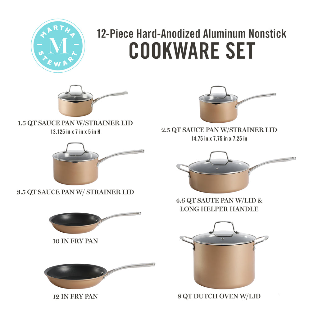 As strong as it is versatile, the 12-piece Color Anodized Aluminum Cookware Set from Martha Stewart is a collection of pots and pans for the home cook who appreciates efficient cooking and easy-going entertaining. Crafted from heavy-gauge, hard-anodized aluminum, this durable cookware set heats and cooks evenly to achieve culinary perfection in any recipe. Made without PFOA, the cookware's interiors feature a triple-layer Platinum SR nonstick coating for extra durability, smooth food release, and easy cleanup. Serve up family favorites or new recipes from the stove or oven to the table using the strong, double-riveted handles for a sturdy and confident grip. Vented, tempered glass lids fit perfectly to lock in heat, moisture, and flavors. They also help monitor cooking progress without constantly lifting the lids and checking to take the guesswork out of cooking. Built for style and function, this collection is safe to use on gas, electric, ceramic, and halogen stovetops. The pots and pans are oven safe up to 480°F, while the glass lids are safe up to 350°F. Dishwasher safe, hand wash recommended.