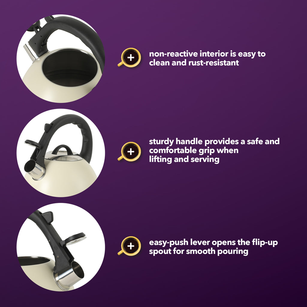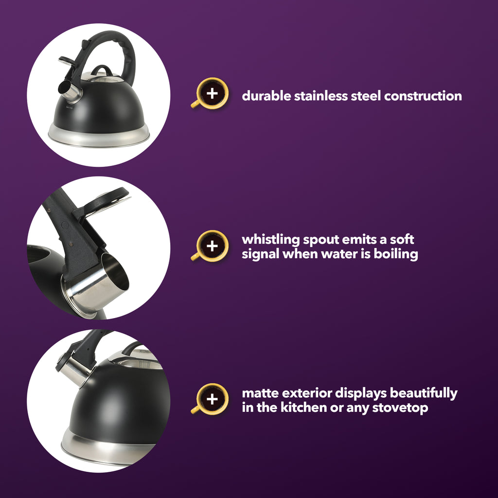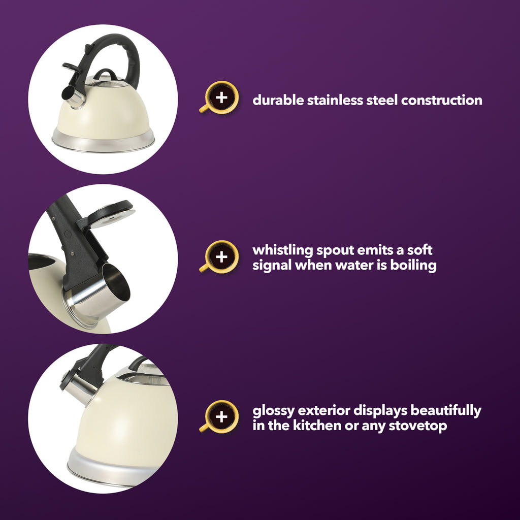 - WHISTLING TEAKETTLE: Modern teakettle with a traditional whistling spout that emits a soft signal when water has come to a rolling boil. Perfect for everyday use, it allows you to have hot water on standby when simmering stews and making stock or when guests come over for a quick chat over coffee or tea.