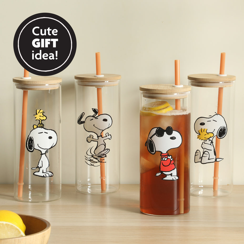 - DRESSED TO CHILL: This set of four glass tumblers, each decorated with colorful Snoopy designs, is perfect for serving or taking your favorite drinks on the go. Made from borosilicate glass, they stay brilliantly clear—not cloudy after multiple washes—and durable enough for daily use and an active lifestyle.