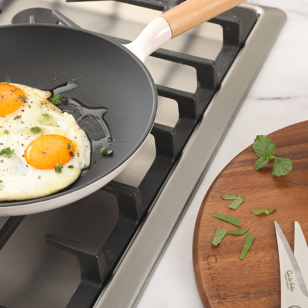 Your dad’s cast iron skillet set the standard—but this one quietly improves on it. The Main Canteen Cast Iron Skillet delivers the same high-heat performance needed for serious searing, browning, and frying, without the shoulder workout that usually comes with it. Built to heat evenly and hold temperature with ease, the nonstick interior grows better with time, developing a natural patina that enhances food release and cuts back on oil and butter. A titanium-reinforced enamel exterior resists stains and cleans up quickly, while the smooth wood handle offers a steady, comfortable grip for moving from stovetop to table. Classic in spirit, smarter by design and ready for every stovetop in the house. Hand wash only. Not oven safe.