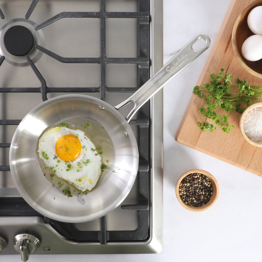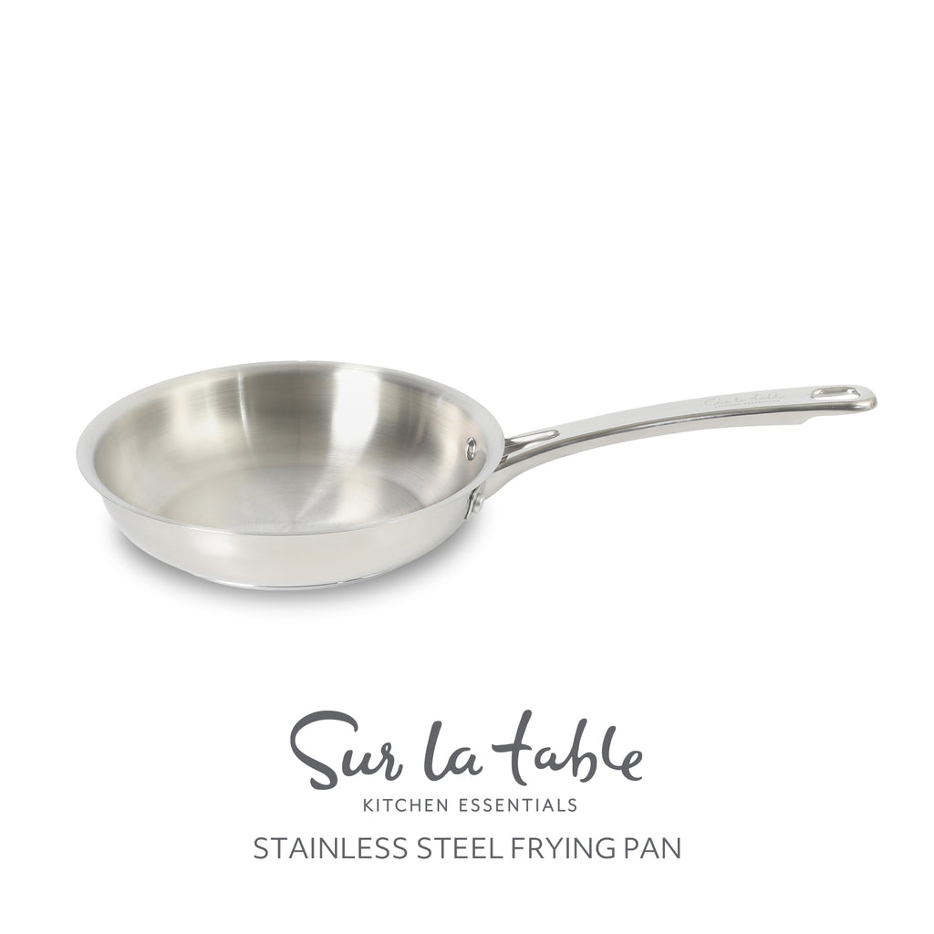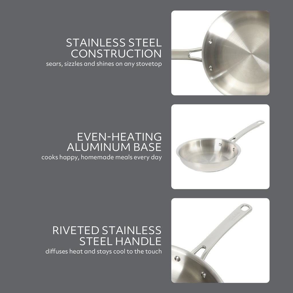 - STAINLESS STEEL COOKWARE: mirror-polish stainless steel frypan is built to last to keep up with serving happy and homemade meals every day. it features an aluminum base that absorbs and distributes heat evenly from any stovetop.