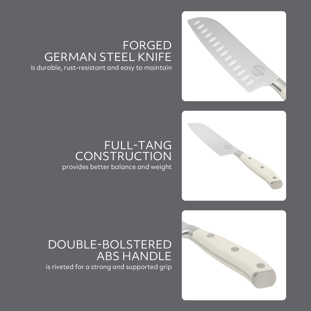 - FORGED GERMAN STEEL KNIFE: crafted from a single piece of high-carbon German steel, the santoku knife features a Granton edge to reduce drag and release cut foods smoothly. favored by home and professional kitchens, German steel is easy to maintain, durable and rust-resistant.
